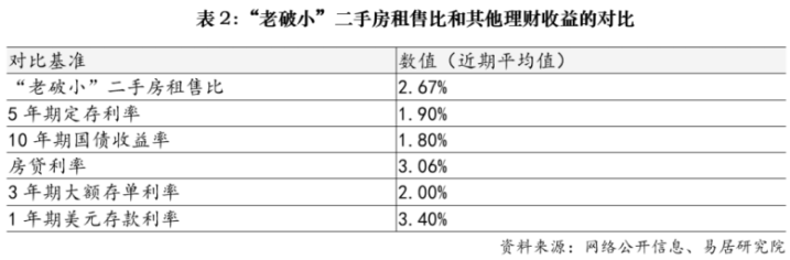 从表中可见,目前上海市区“老破小”相关个案的租售比普遍在2.3%到3.1%之间。在低利率环境下,这一收益率不仅远高于1年期国债收益率,也已跑赢多数银行理财。这也正是为何尽管房源老旧,仍能吸引购房者入场的原因,即月供和租金差不多了。