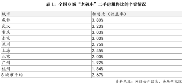 整体来看,租售比已跑赢存款利率,也逐渐接近房贷利率。8个城市平均租售比为2.67%,明显高于1.9%的5年期定存利率、1.8%的10年期国债收益率以及2.0%的3年期大额存单利率。同时,与3.06%的房贷利率相比,也已基本持平。考虑到部分城市房贷利率已低于3%,这意味着在按揭贷款的情况下,租金收入已基本能够覆盖月供。对于偏好人民币资产、看重区位价值的投资者而言,老破小已具备一定的类固收属性。